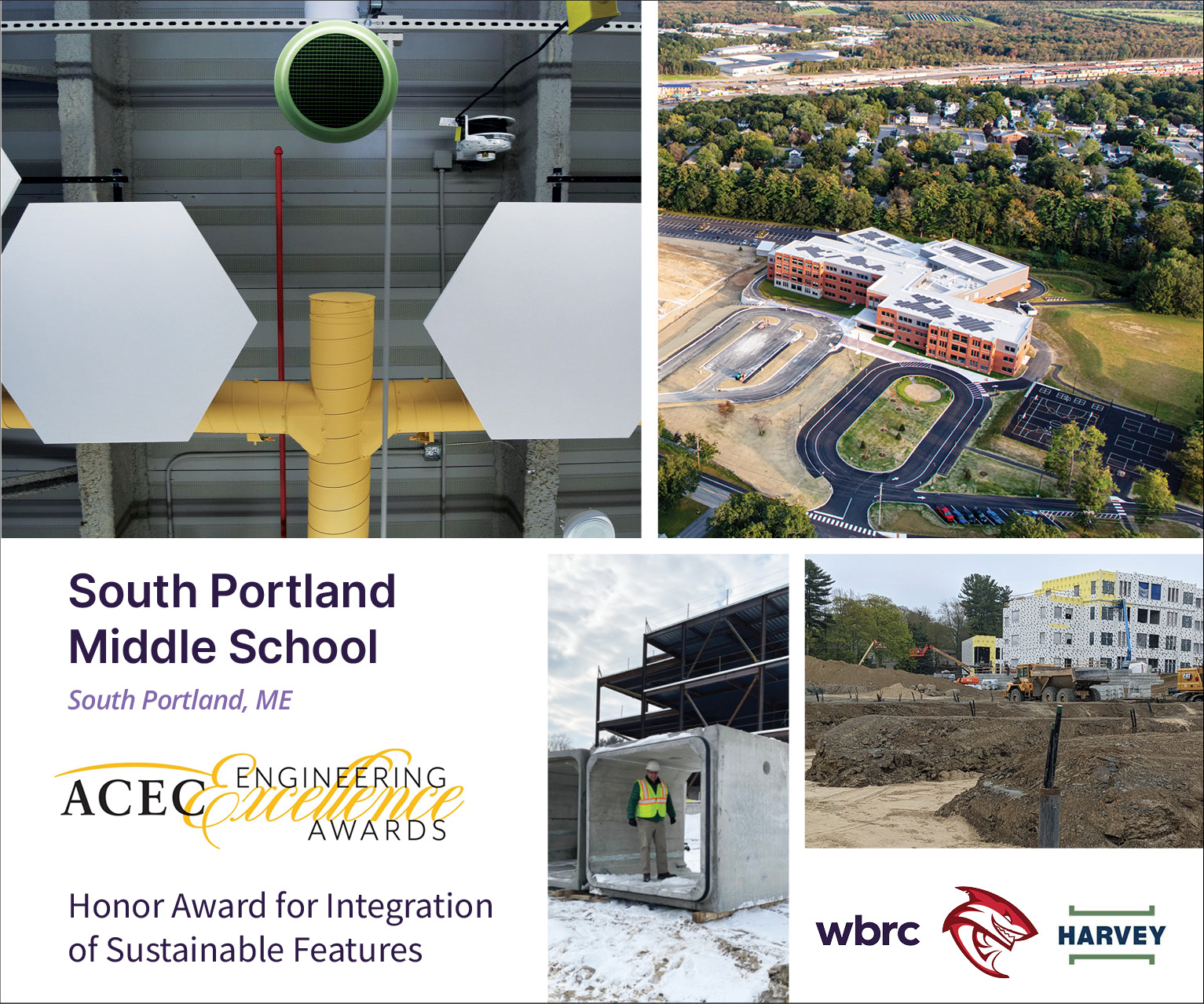 (Bangor and Portland, ME – November 2023) – South Portland Middle School has earned the 2023 Honor Award for Integration of Sustainable Features from the American Council of Engineering Companies (ACEC) of Maine. The award was presented to the school’s design team, WBRC, at ACEC of Maine’s 2023 Fall Forum on November 15 at the University of Maine in Orono, ME.