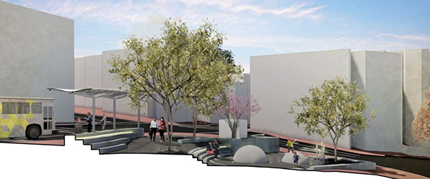 WBRC’s design divides Bramhall Square into three levels, with grade changes held in place by stepped seating and raised planting beds. The south end features a covered bus stop facing Congress Street. A play area with whimsical pods is at the north end and includes permanent seating and raised gardens. The central area accommodates pedestrian through-traffic while providing shaded space for additional activities and seating. Ground level lighting and fun free-standing light bars are also part of the design concept, making Bramhall Square inviting even after the sun goes down. The grading concept is designed to mitigate storm-water run-off while simultaneously creating three small outdoor “rooms” where people can rest, gather, and play.