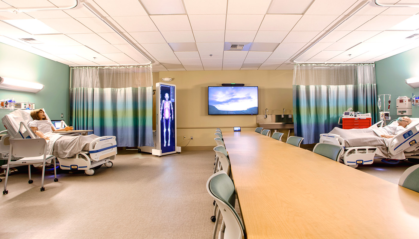 The project transformed a former lecture hall into an interactive learning lab by raising its floor and lowering the ceiling to make it level with the ground floor of Folsom Hall. The fully-accessible space was designed to look and feel like an acute care setting. The project scope included infrastructure upgrades along with new sustainable lighting and durable finishes.